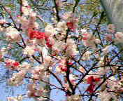 これは五条天神の境内の桃。 三色の花がいっぺんに咲いていて、斑入りのものもあってとても可愛かったです^^